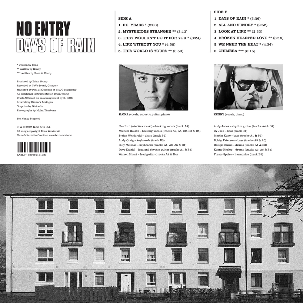 DAYS OF RAIN is the 2025 album from Glasgow based pop/rock band, No Entry, fronted by founder members Ilona and Kenny. It marks a long- awaited return since their debut EP, Cold and Lonely Lives, their significant contributions to the highly sought after compilation albums Running In Mazes and Journey Without Maps, and their coveted feature on The Old Grey Whistle Test Pick of the Year Special.
